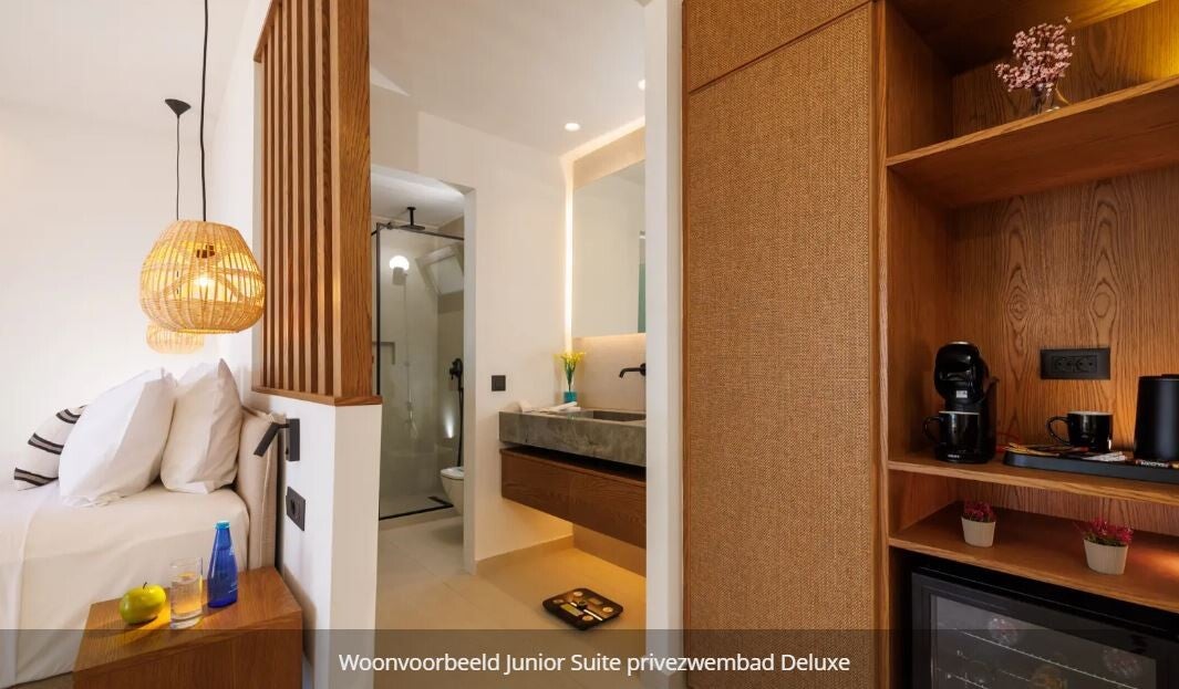 De Junior Suite met privézwembad* Deluxe (max. 2 personen) heft een oppervlakte van 35 m2, een heerlijk tweepersoons bed, badkamer met inloopdouche, privézwembad en een heerlijk terras. Natuurlijk vind je ook airco, wifi en koffie/thee faciliteiten.